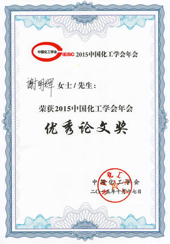 熱烈祝賀我司謝明輝博士榮獲2015中國化工學(xué)會年會“優(yōu)秀論文獎”